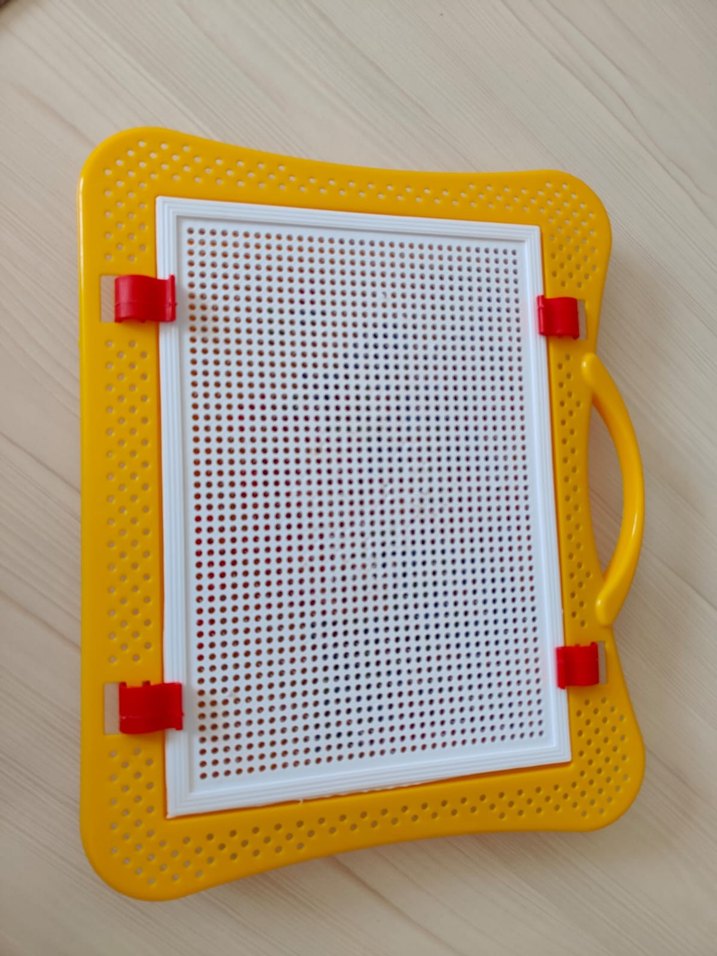 Sarı renkli eğitim oyuncağı tahtası, taşıma kolaylığı sağlayan sap ve etkileşimli oyun için delikli yüzeye sahiptir.