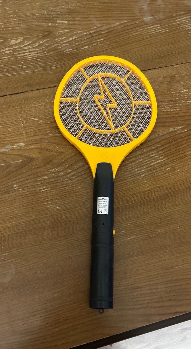 Renkli sarı elektrikli sinek öldürücü, etkili böcek kontrolü için ızgara ve rahat siyah sap içerir. ⚡ Çalışır durumda ama pil koyma kapağı kayıp