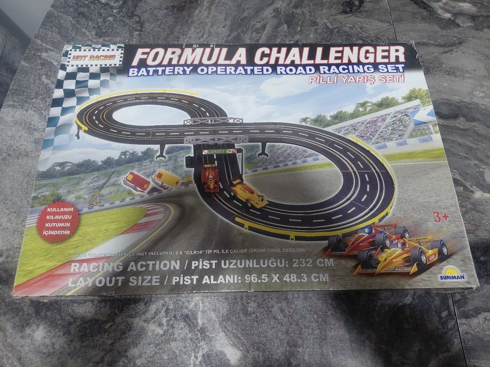 Pilli çalışan, 232 cm uzunluğunda pist ve 96.5 x 48.3 cm pist alanına sahip renkli sarı oyuncak yarış arabası seti. Döngülü pist bölümü içerir.