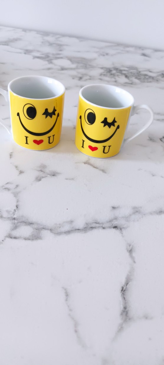 İki adet sarı renkte, göz kırpan gülen yüz ve "I ♥ U" yazılı kupa. Beyaz saplı ve iç yüzeyli.