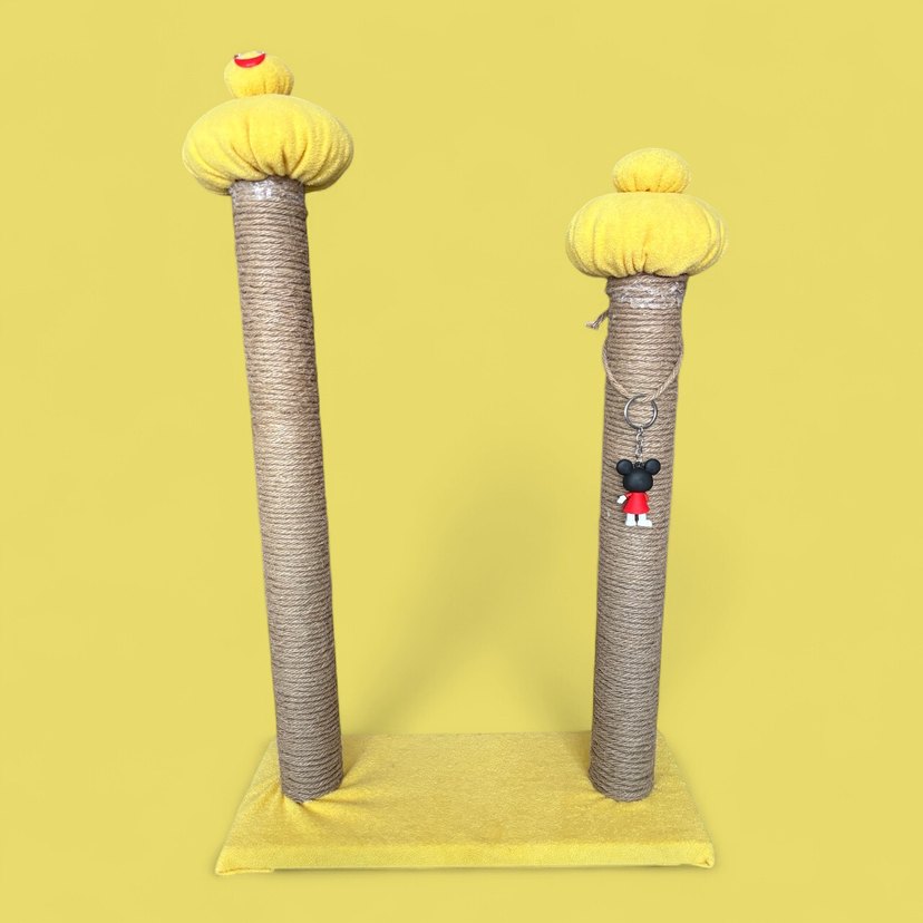 İki dikey doğal ip sarılı tırmalama direği, yumuşak sarı üst kısımlar ve peluş tabanlı renkli kedi tırmalama tahtası. Küçük oyuncaklıdır.