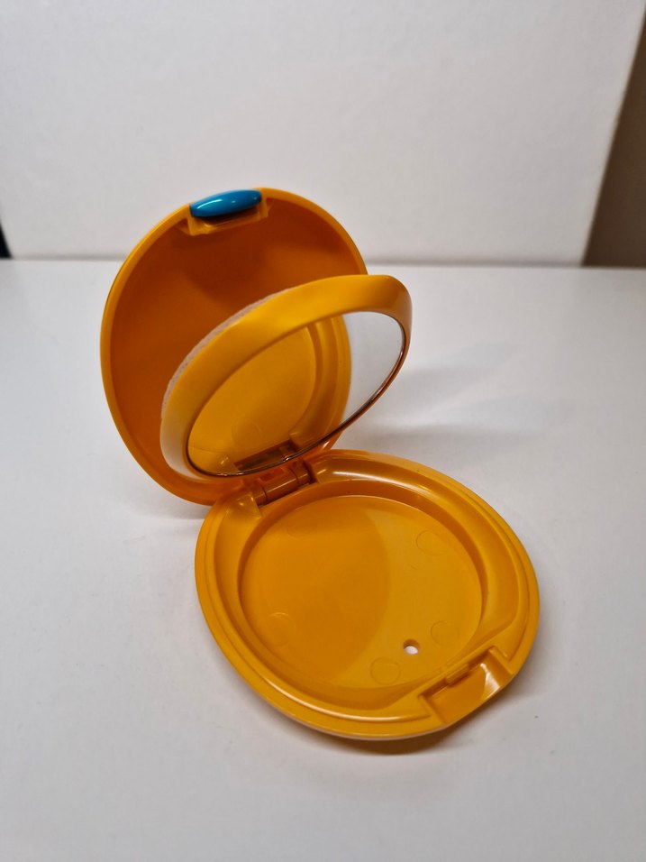 BOŞ , TEMİZ Sarı renkli, iç kısmında ayna ve güvenli kapanma mekanizması bulunan kompakt pudra kabı.