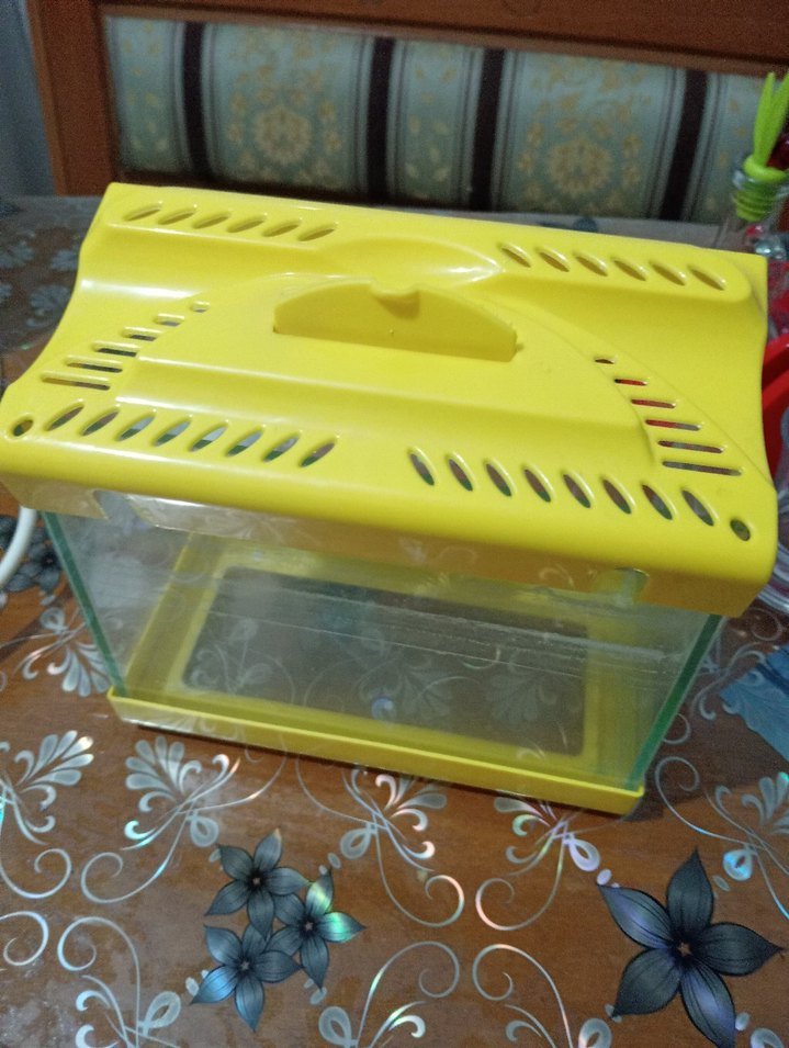 Sarı renkli kapağı, havalandırma delikleri ve taşıma sapı olan küçük evcil hayvan kafesi. Şeffaf tabanı kolay temizlik sağlar. akvaryum veya motoru var