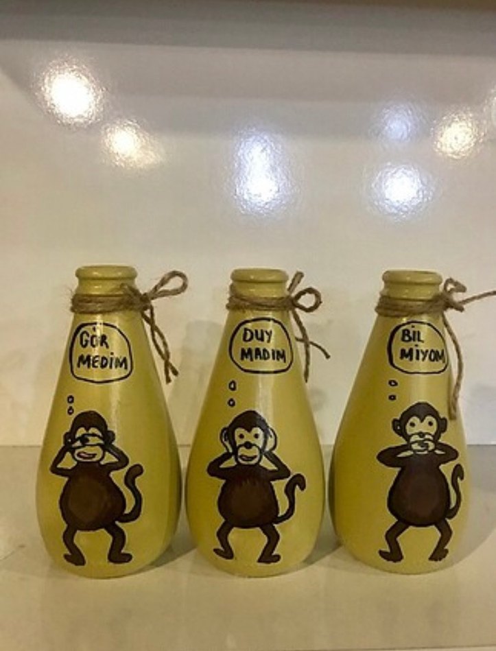 Üzerinde maymun figürleri ve gri yazılar bulunan, boyun kısmında ip bağlı üç sarı vazo seti. Her vazoda farklı bir yazı yer alır.