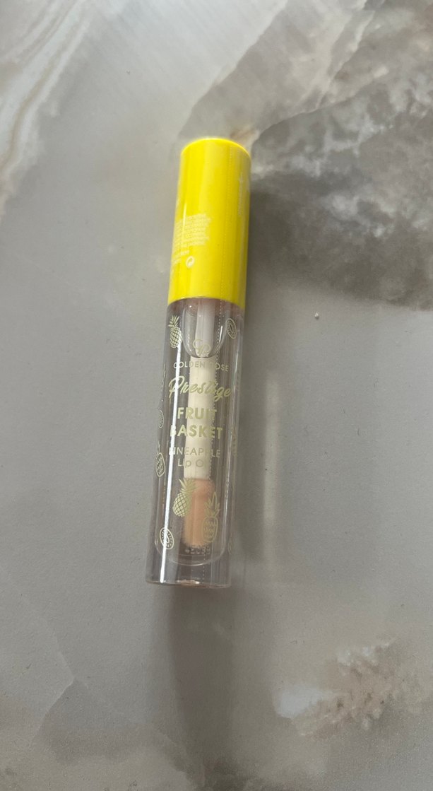Sarı kapaklı ve ananas desenli şeffaf ambalajda meyveli, ananas aromalı renkli bir lipgloss.