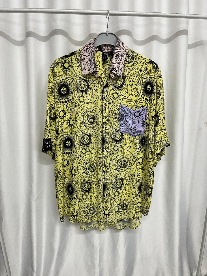 Renkli batik desenli, kısa kollu, yakalı ve düğmeli, sentetik kumaştan üretilmiş, bol kesim mini uzunlukta kadın gömleği. Bohem ve grunge punk tarzını yansıtır.