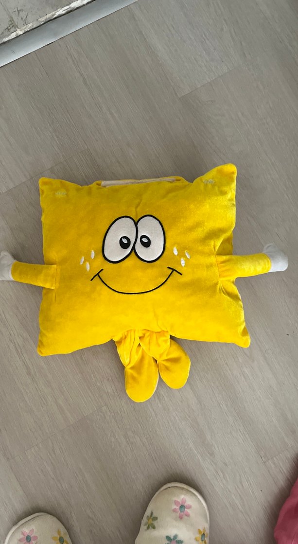 Gülümseyen yüzü ve uzanan kollarıyla yumuşak sarı peluş oyuncak, sarı canlı rengiyle neşeli bir dokunuş sağlar.