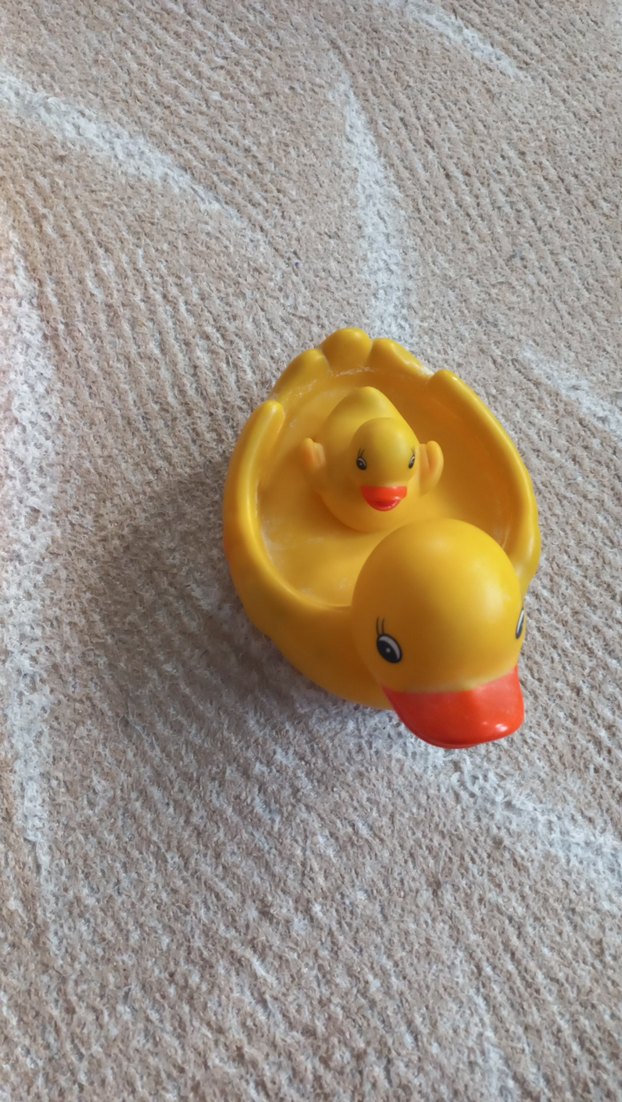 Sarı renkli, içinde küçük bir ördek bulunan renkli su oyuncağı.
