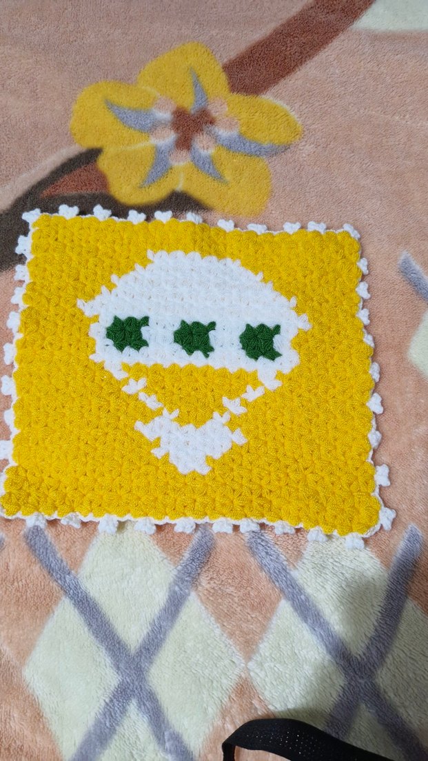 Renkli sarı örgü banyo süngeri, yumuşak ve el yapımı desenlidir. Nazik temizlik sağlar ve farklı bir görünüm sunar.
