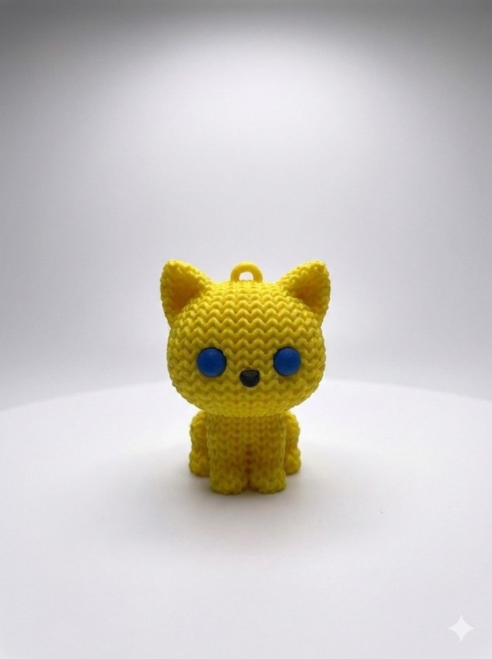 Mavi gözlü, dokulu yüzeye sahip renkli sarı peluş kedi figürü. Üstünde asma halkası bulunur.