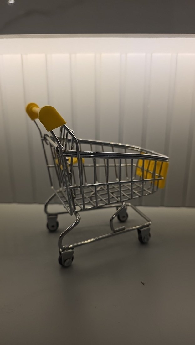 Metal yapılı, küçük tekerlekli, sarı renkli ve renkli oyuncak alışveriş arabasıdır.