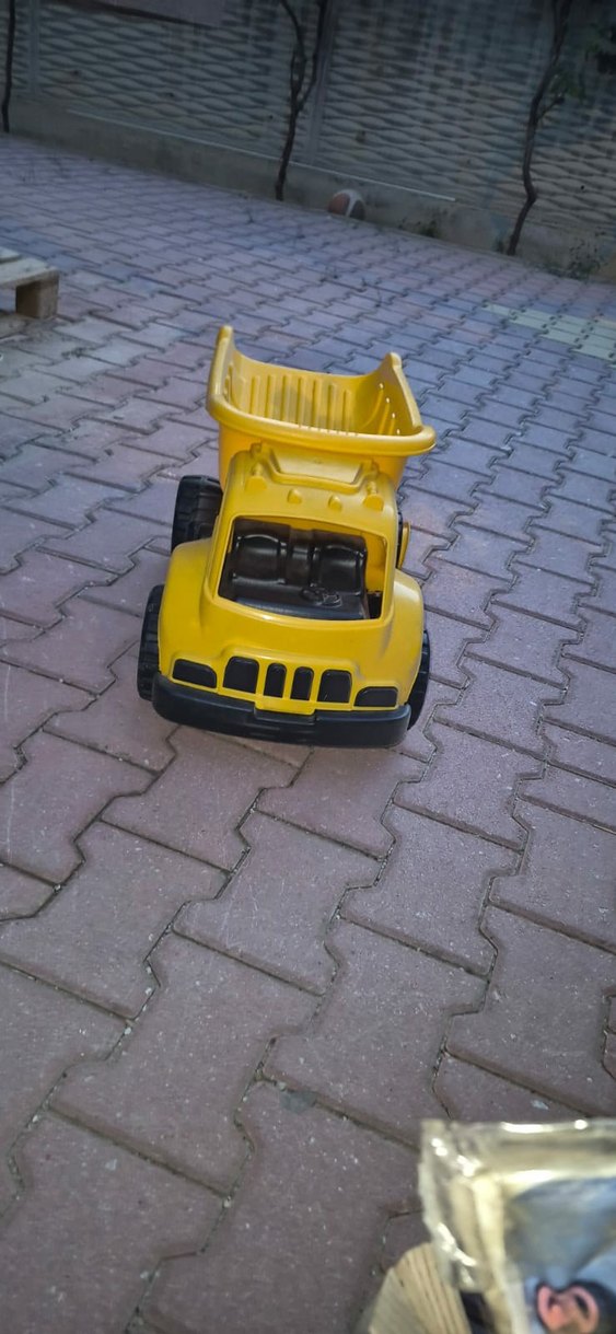 Sarı renkli oyuncak araba, büyük siyah tekerlekleri ve renkli tasarımıyla hayal gücünü destekler.