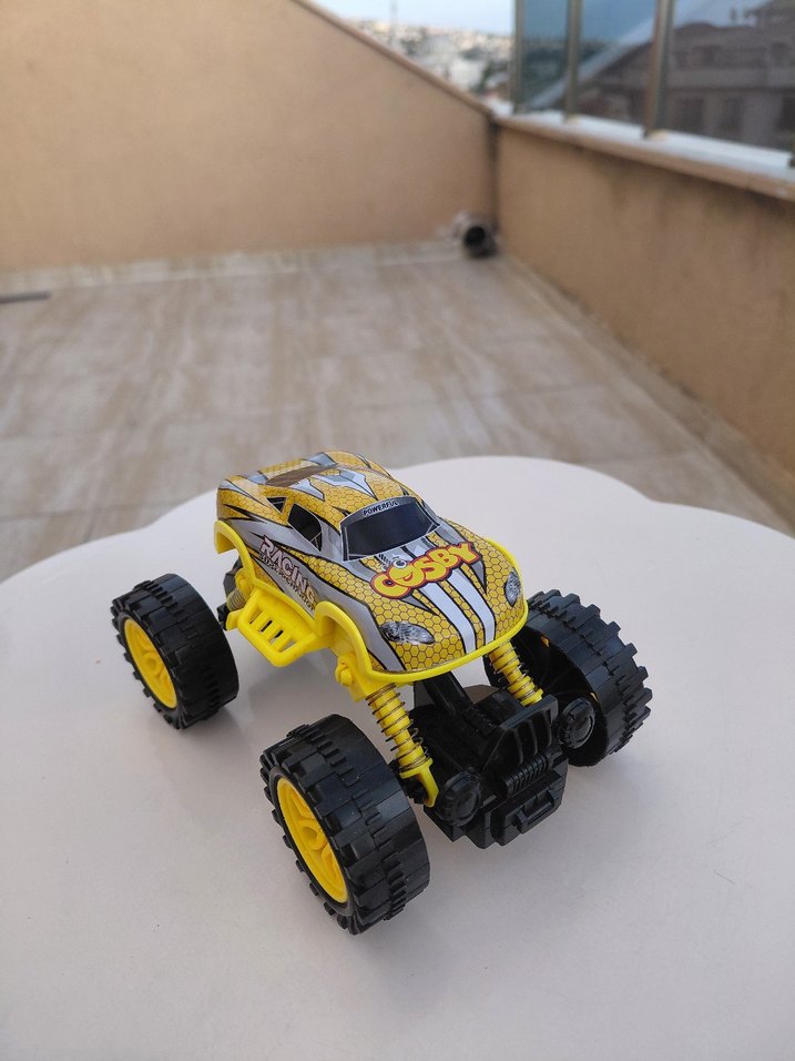 Sarı renkli oyuncak araba, büyük siyah tekerlekleri ve renkli sportif tasarımıyla dikkat çeker. Sağlam yapıya sahiptir.