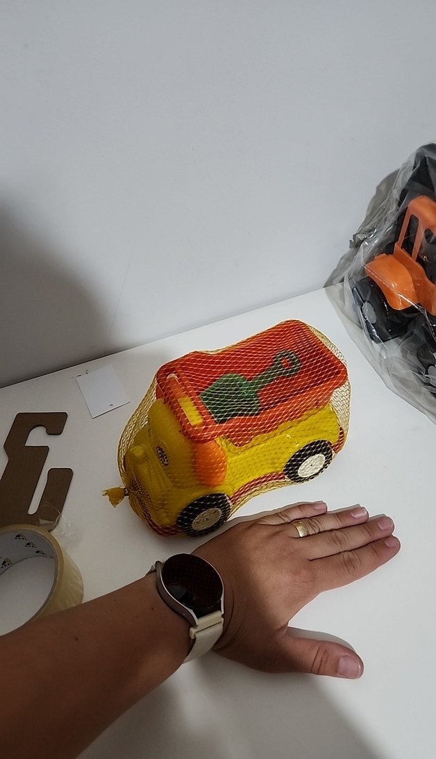 Renkli sarı oyuncak araba, basit tasarımlı ve file içinde paketlenmiş. Çocuklar için uygun bir oyun aracı.