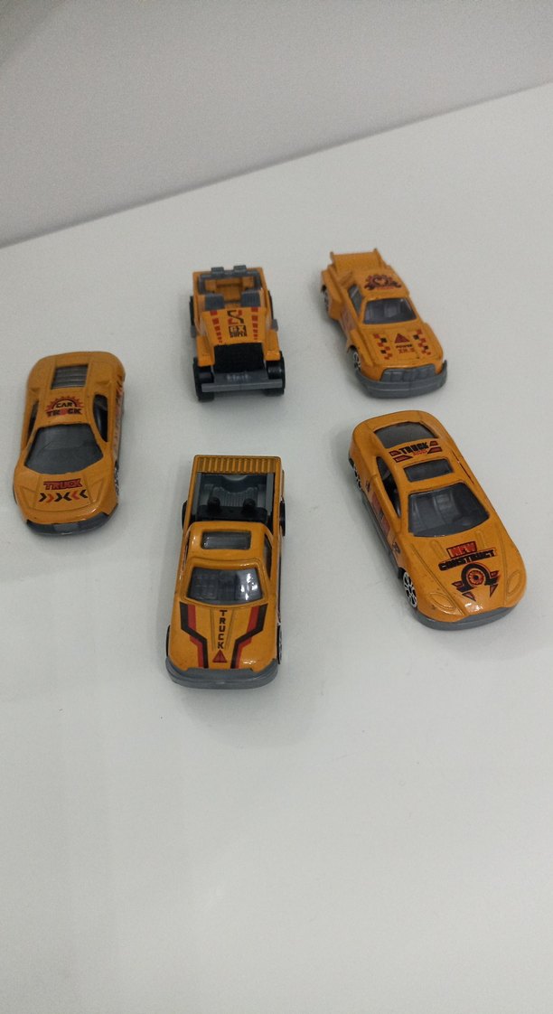 Farklı tasarım ve detaylara sahip beş renkli sarı oyuncak araba seti. Oyun ve koleksiyon için uygundur. metal