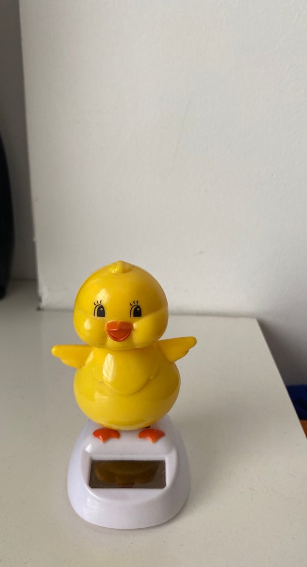 Canlı sarı renkte, beyaz kaide üzerinde duran oyuncak civciv figürü. Güneş ışığında sallanır