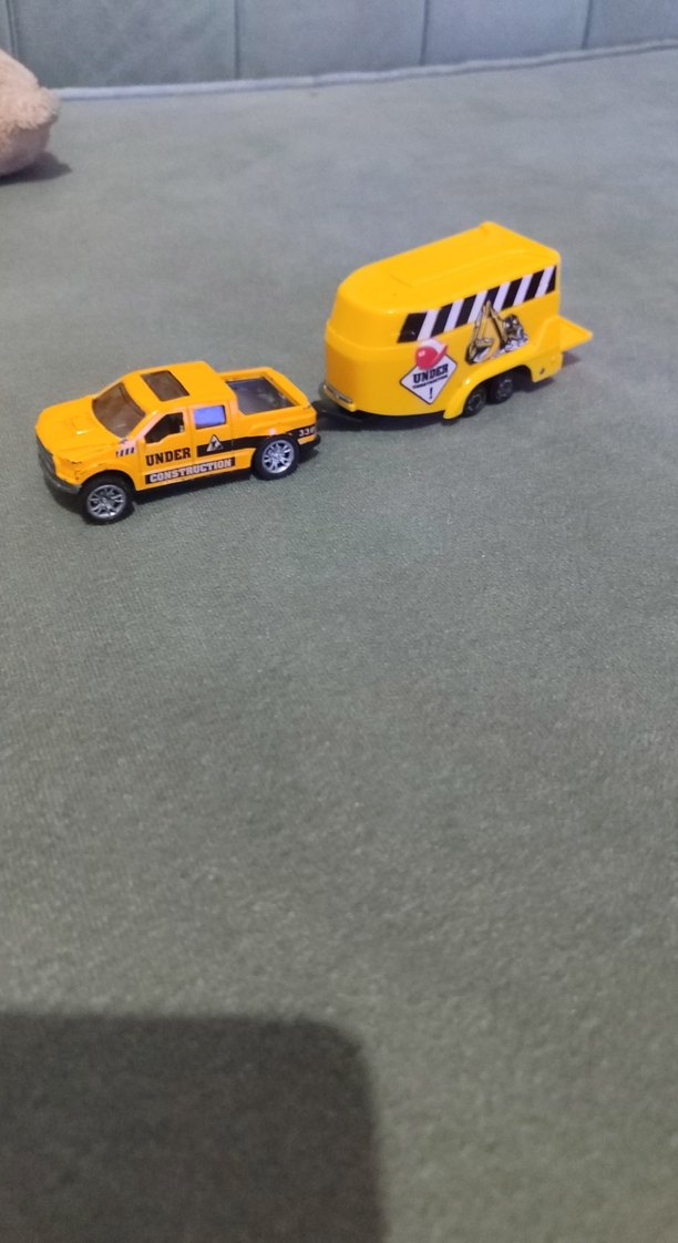 Sarı renkli oyuncak inşaat aracı, römorku ile birlikte hayal gücünü destekler. karavan bir tekeri koptu kullanıma engel değil hediye edeceğim toplu alım da