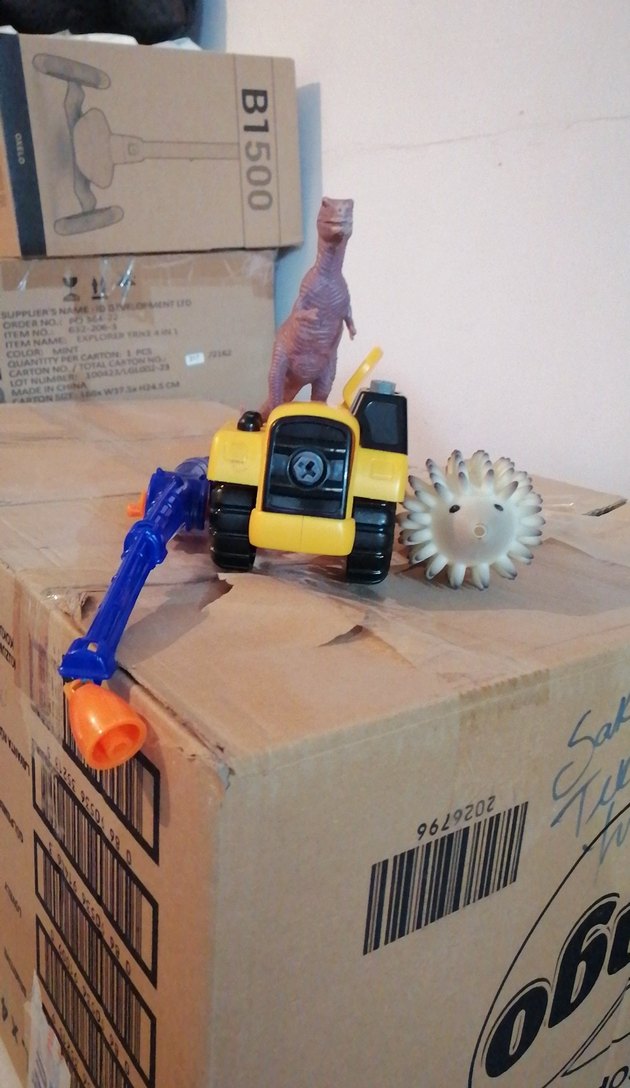 Sarı renkli oyuncak iş makinesi, mavi kol ve dikenli silindir ile birlikte küçük bir dinozor figürü içerir. Üzerinde 1500 sayısı bulunur.