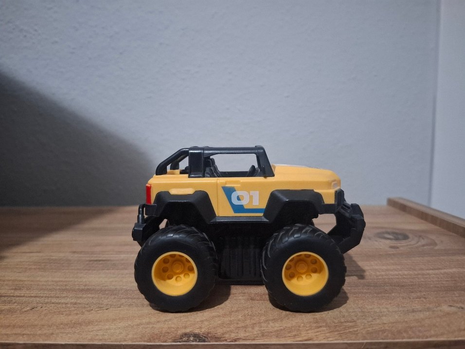 Büyük tekerlekli, sarı renkli oyuncak jeep araba, renkli ve eğlenceli tasarıma sahiptir.