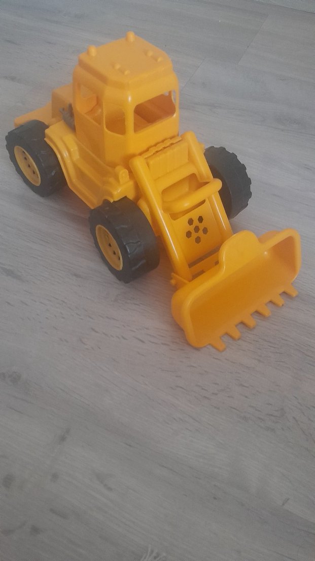 Büyük siyah tekerleklere sahip renkli sarı oyuncak kepçe, hayal gücünü destekler.
