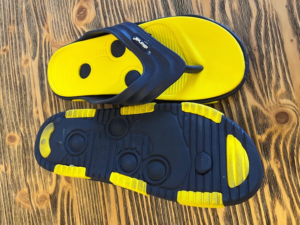 Sarı tabanlı, siyah bantlı erkek terlik. Kauçuk tabanı kaymaz özellikte, sportif ve günlük kullanıma uygun