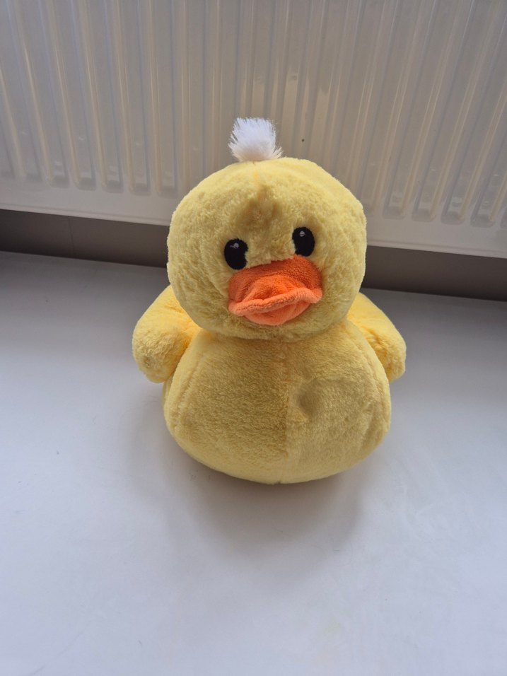 Yumuşak ve renkli sarı peluş ördek oyuncak, başında küçük bir tüy ve turuncu gagası var. Sarılmak için ideal. Kızım sevmediği için oynamadığı için satıyoruz.