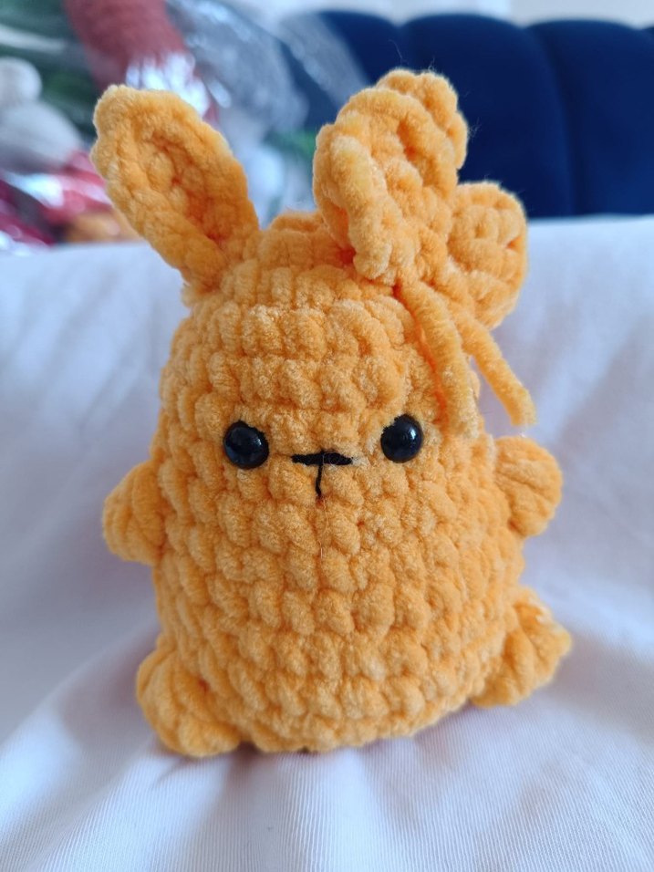 Yumuşak dokulu, sarı renkli peluş tavşan oyuncak, siyah gözler ve küçük buruna sahiptir.