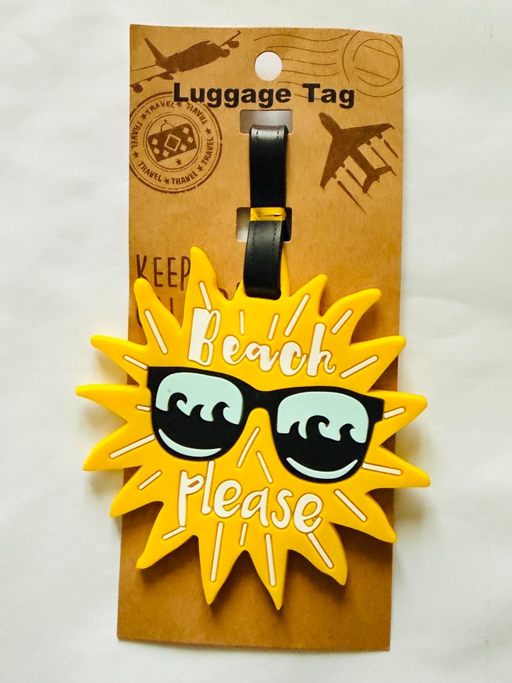 Renkli sarı bavul etiketi, güneş ve güneş gözlüğü tasarımı ile 'Beach please' yazısını taşır.☀️