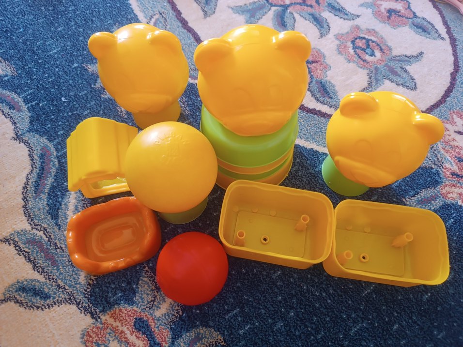 Sarı renkli plastik oyuncak seti, ayı başları ve toplar gibi çeşitli şekiller içerir. Canlı ve eğlenceli tasarım.
