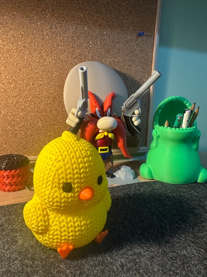 Sarı renkli, dokulu yüzeye sahip sevimli civciv figürü, turuncu gagası ve ayaklarıyla dikkat çekiyor. 3D kendi baskım istenilen boyutta yapılır görsel 10 cm boyunda