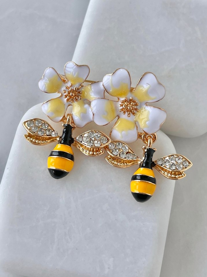 Sarı Renkli Taşlı Arı ve Çiçek Broş