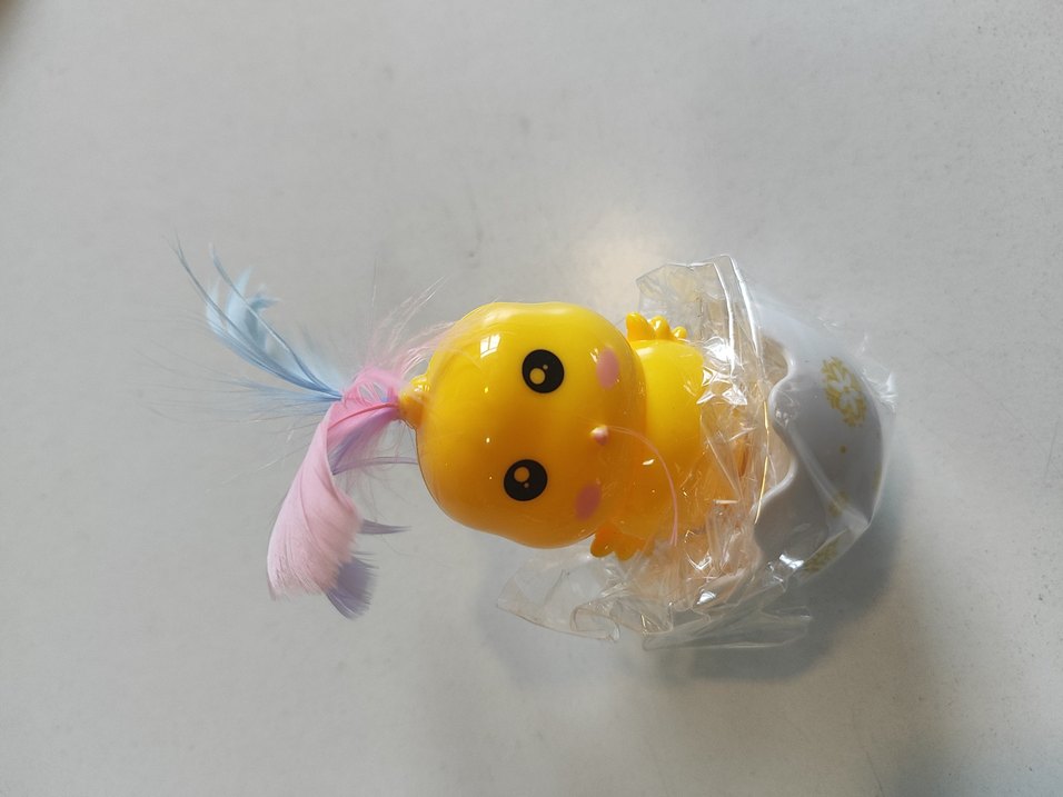 Üstünde yumuşak tüy bulunan, büyük gözlü ve sevimli tasarımlı sarı renkli renkli hacıyatmaz oyuncak.