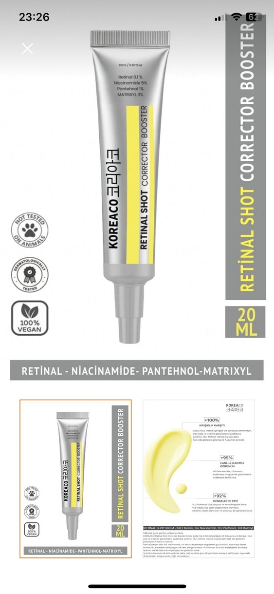Retinal, niacinamide, panthenol ve matrixyl içeren sarı kapatıcı ve aydınlatıcı. %100 vegan, 20 ml. Hayvanlar üzerinde test edilmemiş.
