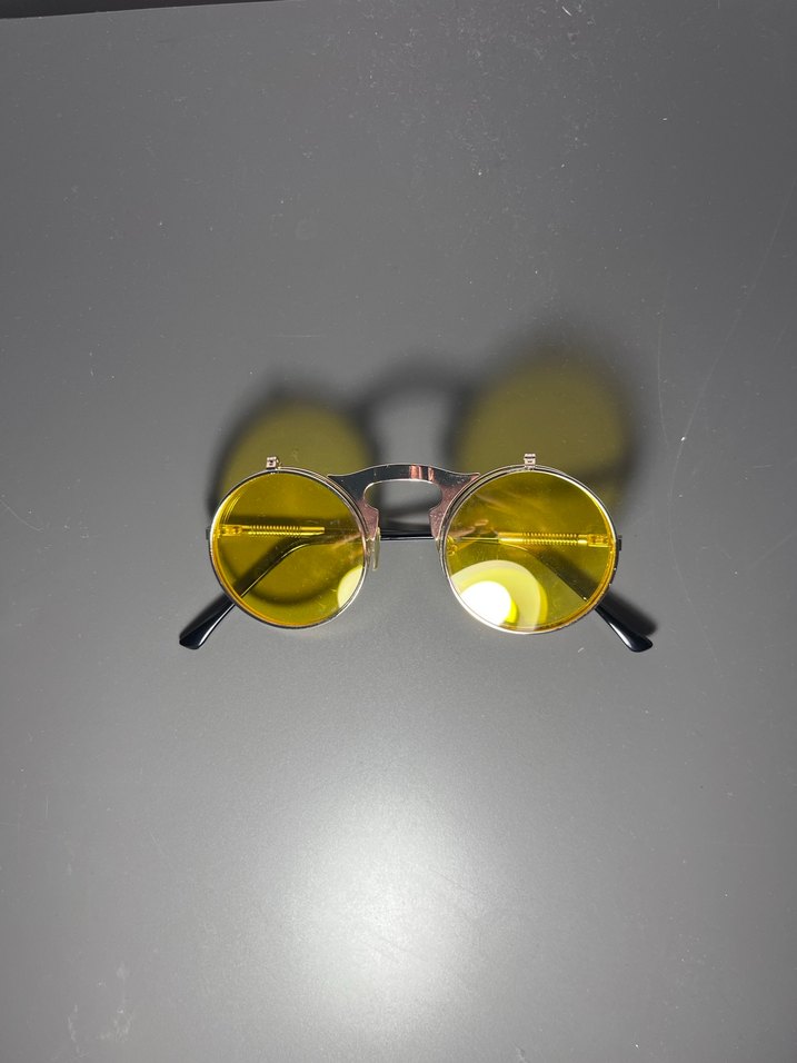 Kemer detaylı yuvarlak sarı camlar, renkli ve retro tarzda, rock punk havası için ideal.