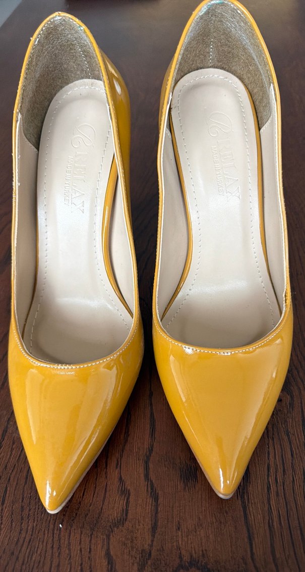 Parlak sarı rugan malzemeden yapılmış, sivri burunlu klasik ve şık kadın stiletto ayakkabı. Ofis için uygun, çağdaş bir tarz sunar.