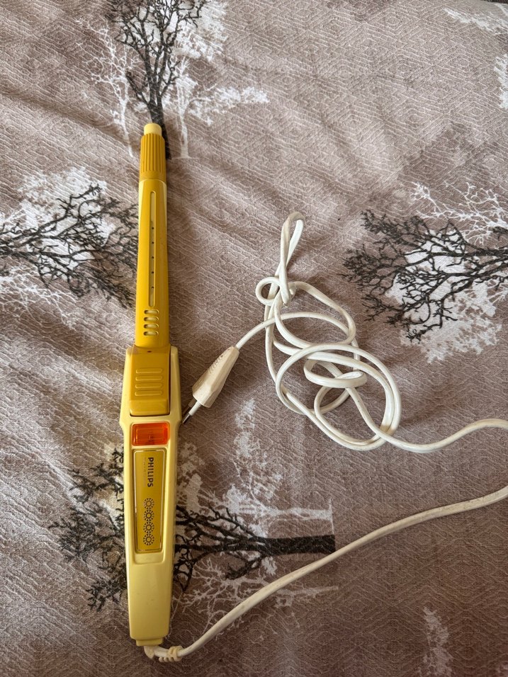 Sarı renkli, ince varilli saç şekillendirici maşa, ayarlanabilir ısı ayarları ve güç göstergesi ışığı ile birlikte beyaz kabloya sahiptir. ♀️