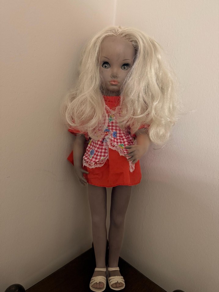 Uzun sarı saçlı bebek, kırmızı elbise ve ekose yelek ile beyaz sandaletler giyiyor.