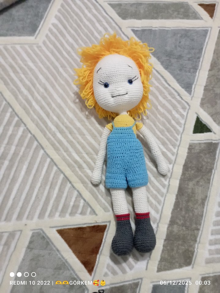 Sarı saçlı, mavi tulumlu, koyu ayakkabılı renkli örgü oyuncak bebek. Yumuşak ve el yapımı, detaylı yüz ifadesine sahip.