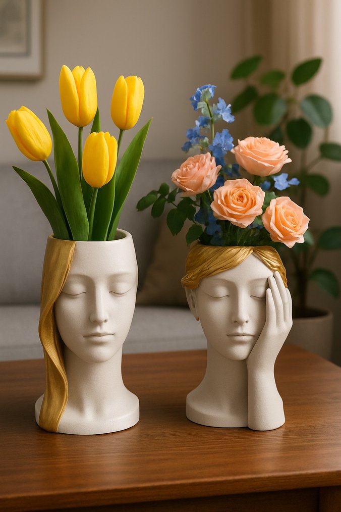 Pastel renklerde, sarı saç detaylı iki yüz figür vazo seti. Canlı çiçeklerle dekorasyon için uygundur.