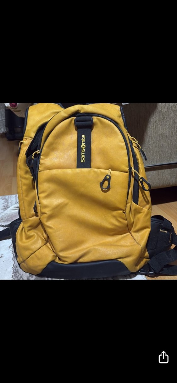 Parlak sarı renkli Samsonite erkek sırt çantası, tokalı kayışlar ve çoklu fermuarlı bölmeler içerir. Trendy casual sokak stiline uygundur. Sadece ön bölgede kullanıma dahil siyah gözle dıkkatlı bakılmadıkca izler var