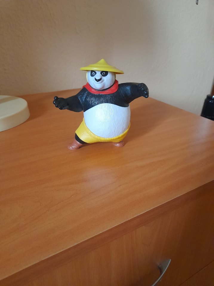 Sarı şapka ve şortlu, kırmızı atkılı renkli panda aksiyon figürü. Eğlenceli pozda durmaktadır. sorunu yoktur #çocuk #oyuncak