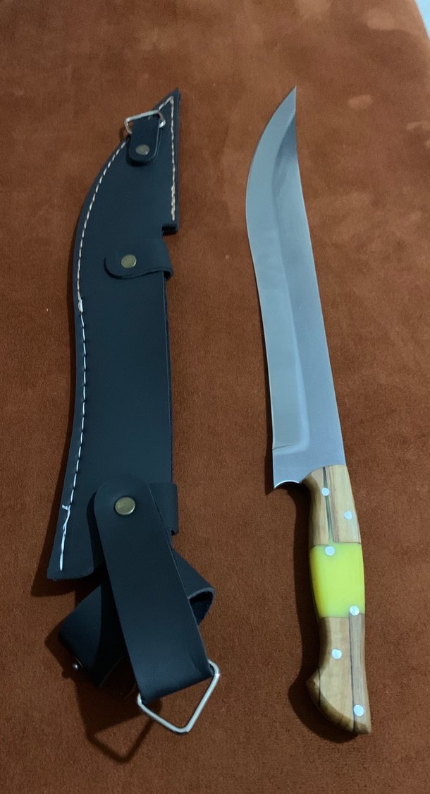 Sarı saplı ve ahşap tutacaklı bıçak, beyaz dikişli koyu renk kılıf ve kemer halkası ile birlikte. Boyu 48 cm dir