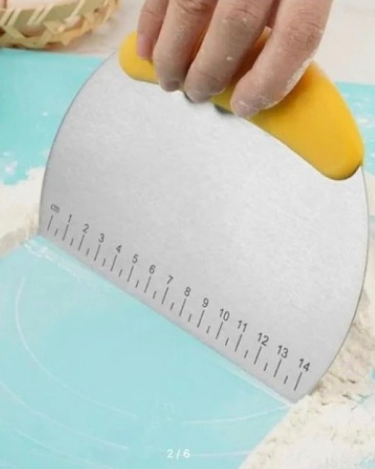 Sarı saplı ve 14 cm ölçü cetveli bulunan paslanmaz çelik hamur kesici, hamur kesiminde hassaslık sağlar.