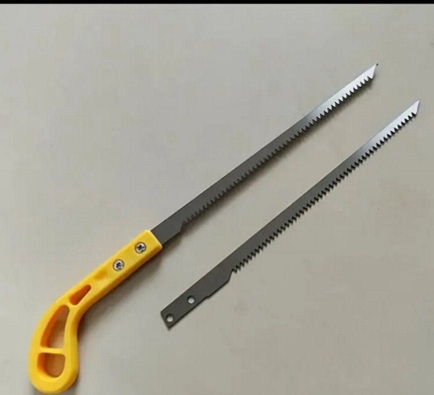 Sarı saplı, keskin dişli çelik testere ve yedek bıçağı bulunur.