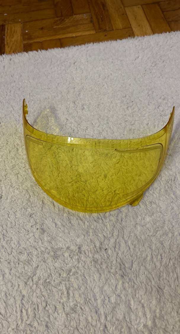 Parlak sarı renkte, şeffaf plastikten motosiklet kask siperliği. Desensiz ve avangart tarzlara uygun şık tasarım.