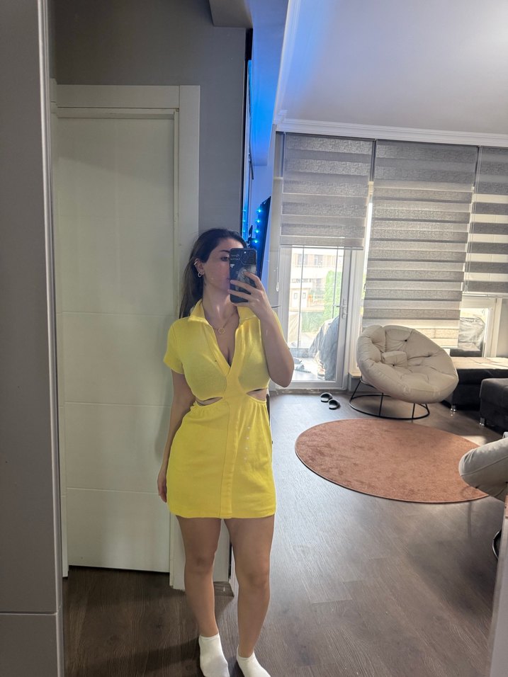Şeffaf detaylı, V yakalı, kısa kollu, sarı mini elbise. Minimalist ve cesur sokak stilini romantik akşamlar için birleştirir. Üst kısımda ufak bir deforme var resimlerde mevcut