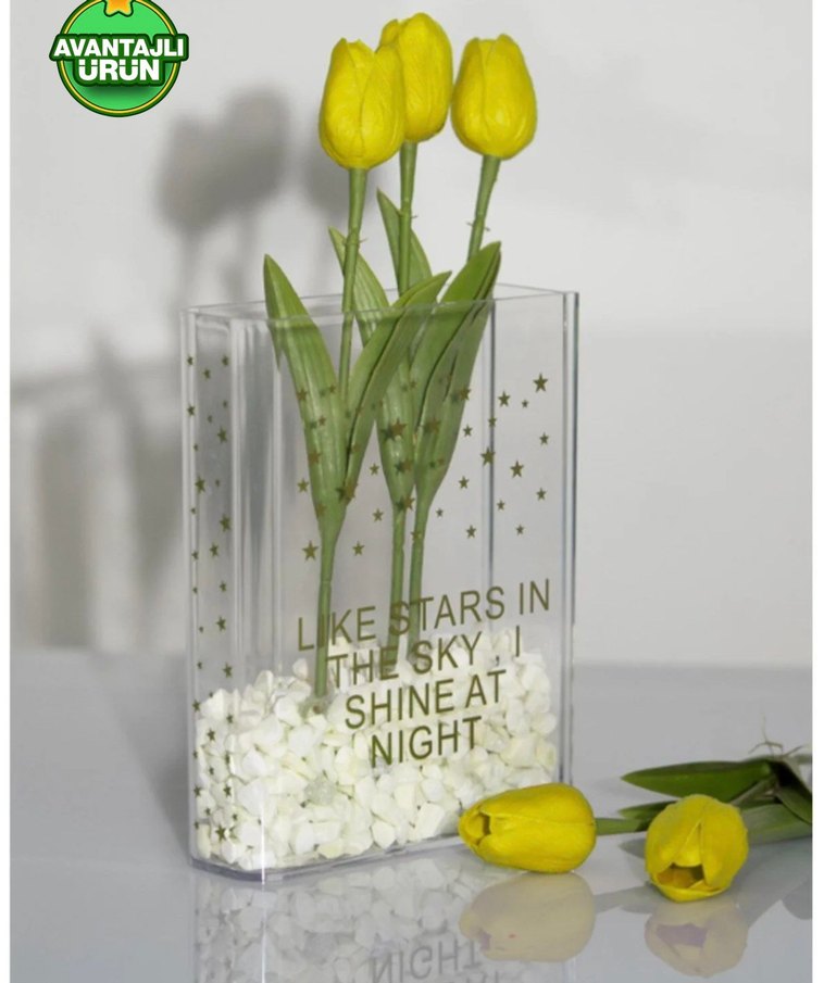 Şeffaf dekoratif vazo Üzerinde yıldız desenleri ve "LIKE STARS IN THE SKY I SHINE AT NIGHT" yazısı yer alır