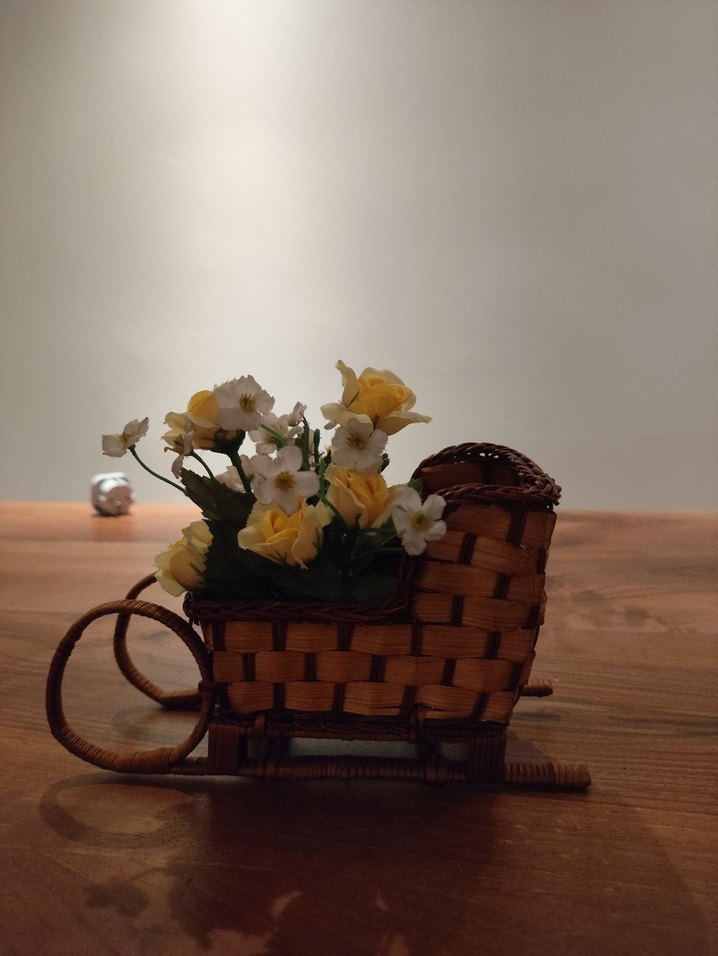 Hafif sarı renkli hasırdan yapılmış, ince yapay çiçeklerle dolu dekoratif sepet.