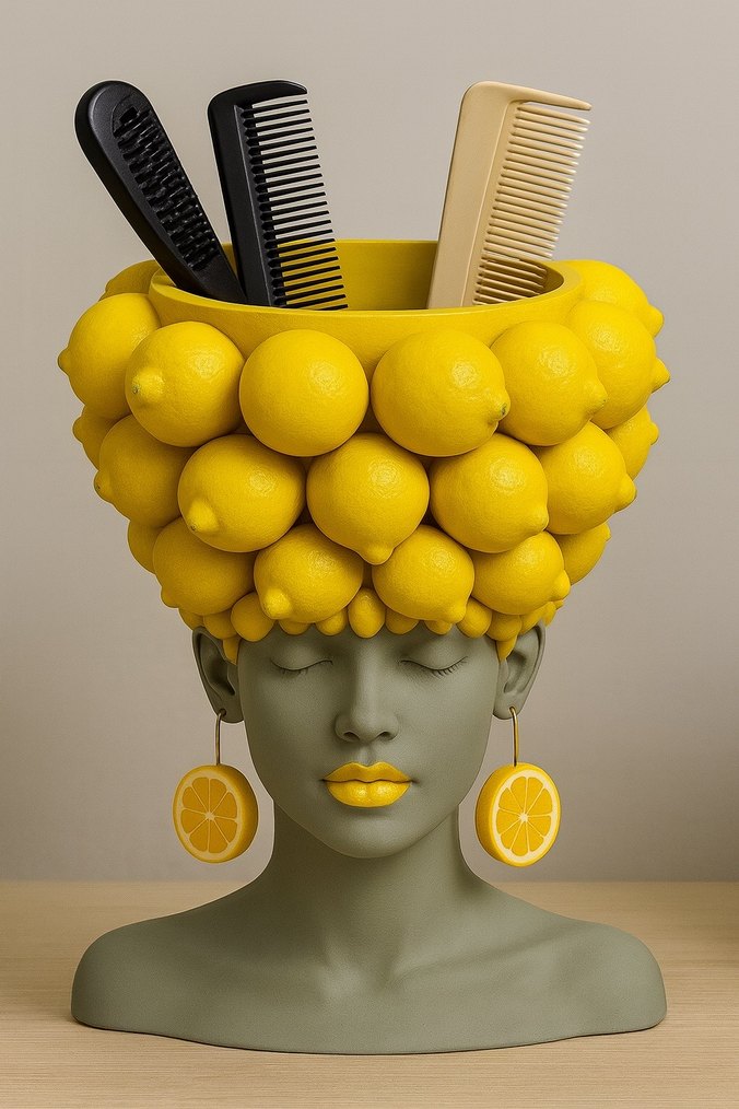 Sarı seramikten yapılmış, limon desenli ve püskül detaylı, avangart tarz için ideal saç aksesuarı tutucu.