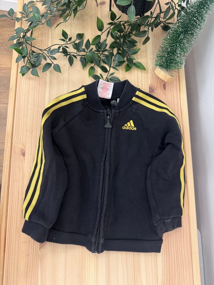 Erkek çocuklar için kapüşonlu, fermuarlı ve dar kesim ceket. Yumuşak kumaştan, koyu sarı ve siyah şeritli, Adidas logolu sokak stili ceket.